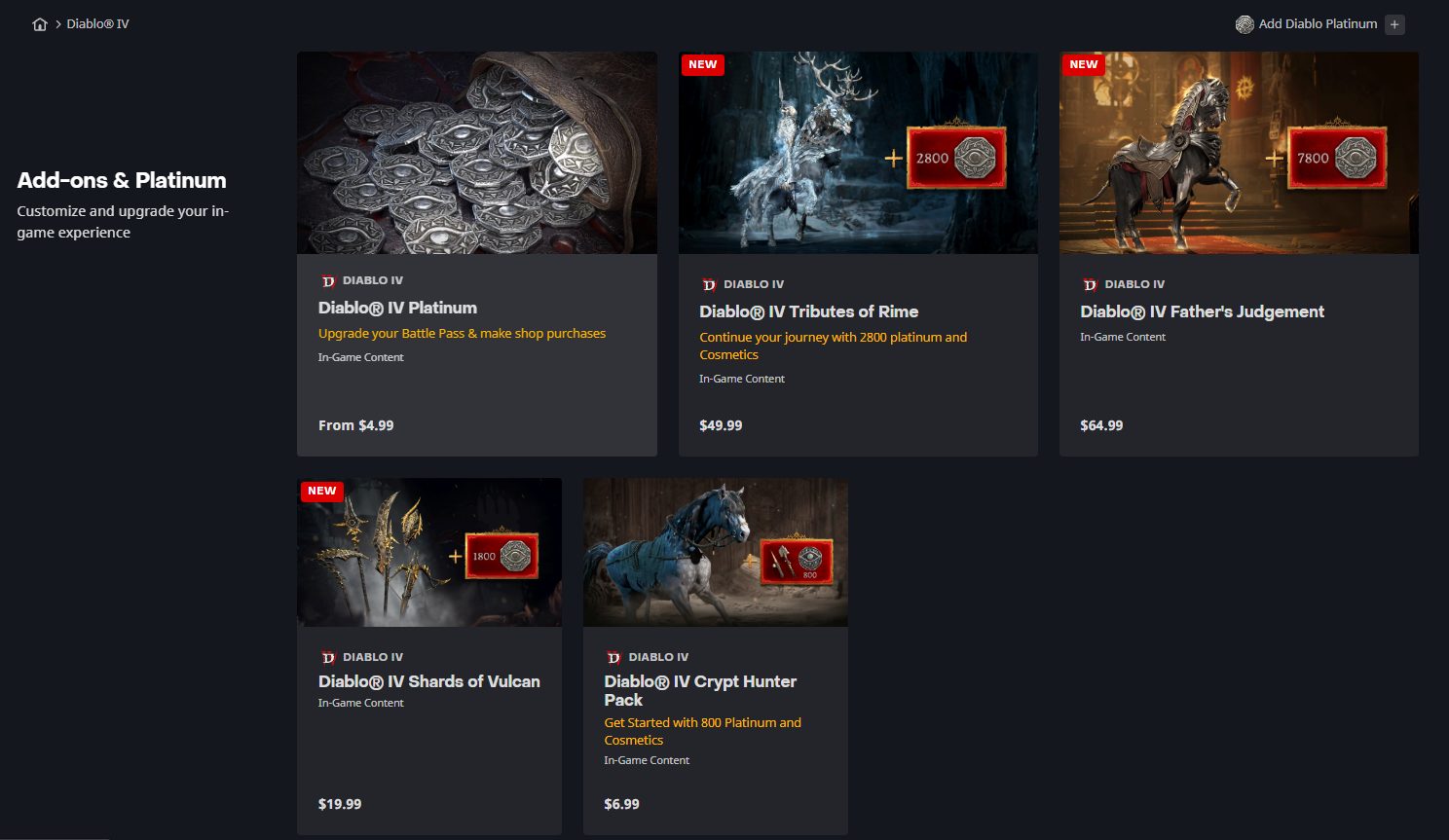 Diablo IV selling both in-game currency for cosmetics, and cosmetics that can’t be bought with in-game currency.