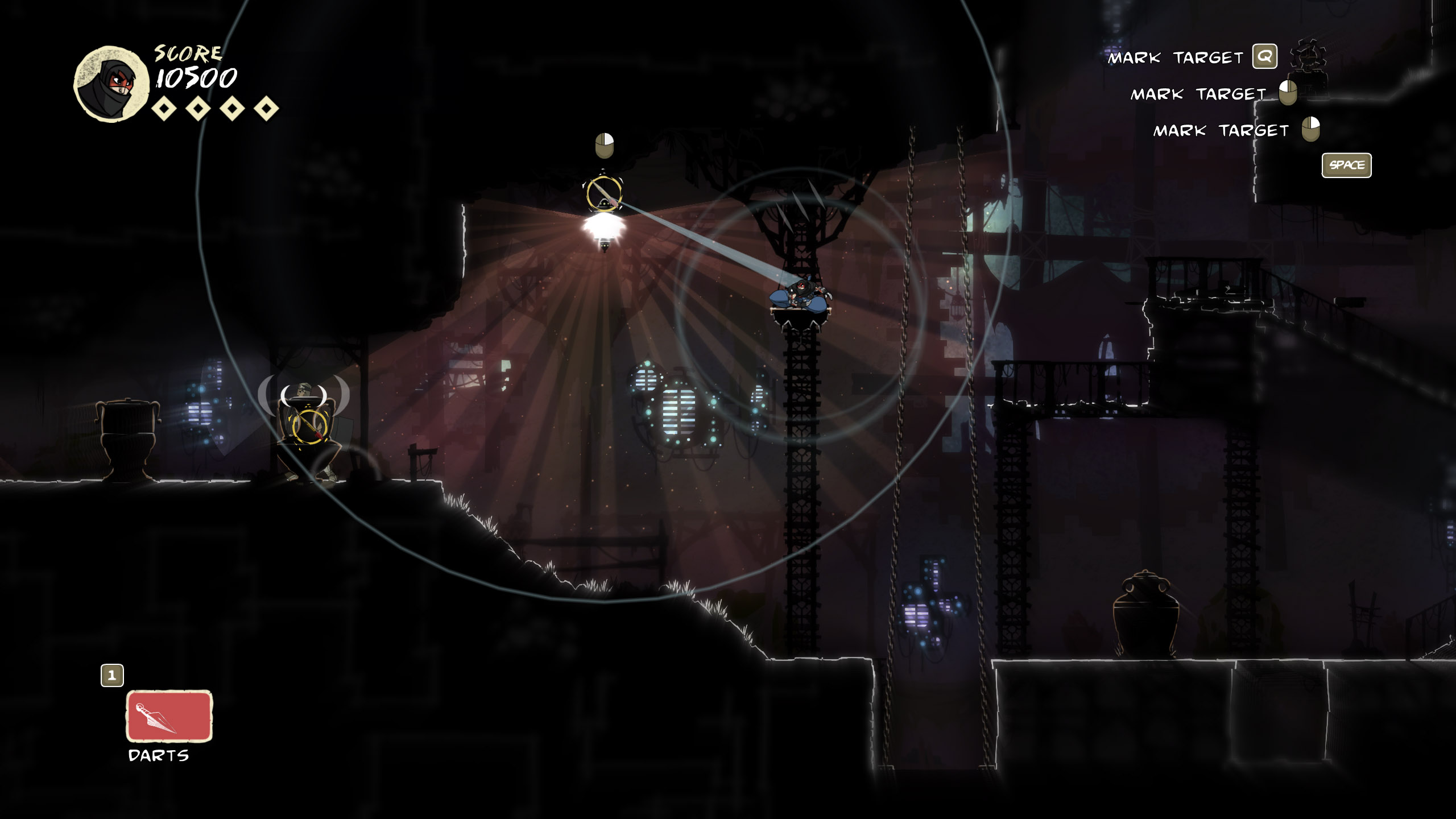 To succeed in the mission, stealth is essential. Paying attention to both light and sounds is important, as either can reveal the ninja’s presence to close-by guards. While facing an individual enemy head-on is possible, everyone besides the ninja has a gun. Getting close requires staying in the shadows.