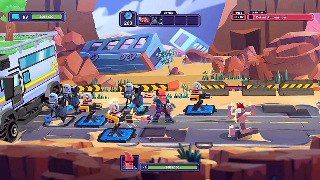 The combat system in The Last Friend is a chaotic mix of classic beat ‘em up with tower defense. This means you control Alpha, who punches and kicks waves of oncoming enemies who are trying to trash his van. Alpha also uses scrap, a currency dropped by enemies, to place dog-operated weapons through the levels, each one has a unique effect. T. Juan the chihuahua has the basic turret, which damages enemies, but Wet Blanket the Barbet fires water bullets which slows them down and can put out fires, and Turtle the German Shepherd can build a shield that halts the incoming enemies. Other dogs, such as Crep the French Poodle and Olivia Newton-John the Jack Russell Terrier enhance Alpha’s abilities, giving him more health points and speed, respectively.