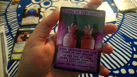 The game plays out in a fairly straightforward manner; the mechanics ended up reminding us of Munchkin and Magic: the Gathering. Everyone draws from a loot deck containing minor trinkets, uses money to buy more powerful treasures, and fights both monsters and tougher bosses by rolling dice. Unlike in the computer game, dying doesn’t set you back to square one; instead, the player takes a “death penalty” that forces them to discard and deactivate beneficial items, and play continues. Once a player has collected the titular four souls, most typically through killing boss enemies, they win the game. The other players can try to prevent this by using items to mess with others’ turns and actions, similarly to how instants work in Magic (the stacking of effects even works the same way). There’s a great variety in enemies and items – the game even sold its Kickstarter with the phrase “it has a lot of cards”. More expansions for the game are planned, similarly to how the computer games got several expansions, so this will certainly become even more the case in the future.