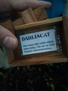 Astumme pimeästä illasta hämärään eteiseen. Paikalla on kolme muutakin joukkuetta jotka yrittävät ratkoa lukitun laatikon koodia. Lukko ratisee tämän tästä, kun ratkaisuja testataan mutta laatikko ei aukea. Onnistumme ensimmäisenä ja toimimme laatikosta löytyvien ohjeiden mukaan. Saamme sähköpostin. Peli on meidän osaltamme päättynyt.
