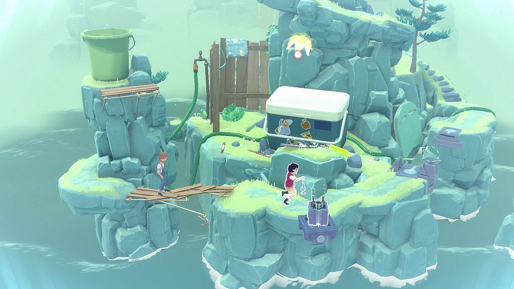 It is the atmosphere of the game that captures the attention before anything else. The menu screen is an image of the two houses where the characters live. This segues into an animation of the characters in the tree house, from where they are suddenly transported to a fantasy realm consisting of small, circular islands; this is where the actual gameplay takes place. The color scheme, from the blue hues of the rainy reality to the dominating greens of the island world, is gentle and purposefully dreamy. The graphics are not exactly detailed, but they are pleasant to regard, and the simplicity therein seems to be an intentional, artistic choice rather than, say, the result of limitations in the budget. The design of the fantasy world, itself, is effective: the islands, made of rock and covered by grass, are littered with items, mementos and images from the characters’ childhood. There are televisions, laundry racks, assorted furniture, tools, video game consoles et cetera. The islands are separated by water: each island represents a single level of the game. The music is minimalistic, ambient, and really quite good, and it further enhances the dreamlike experience.