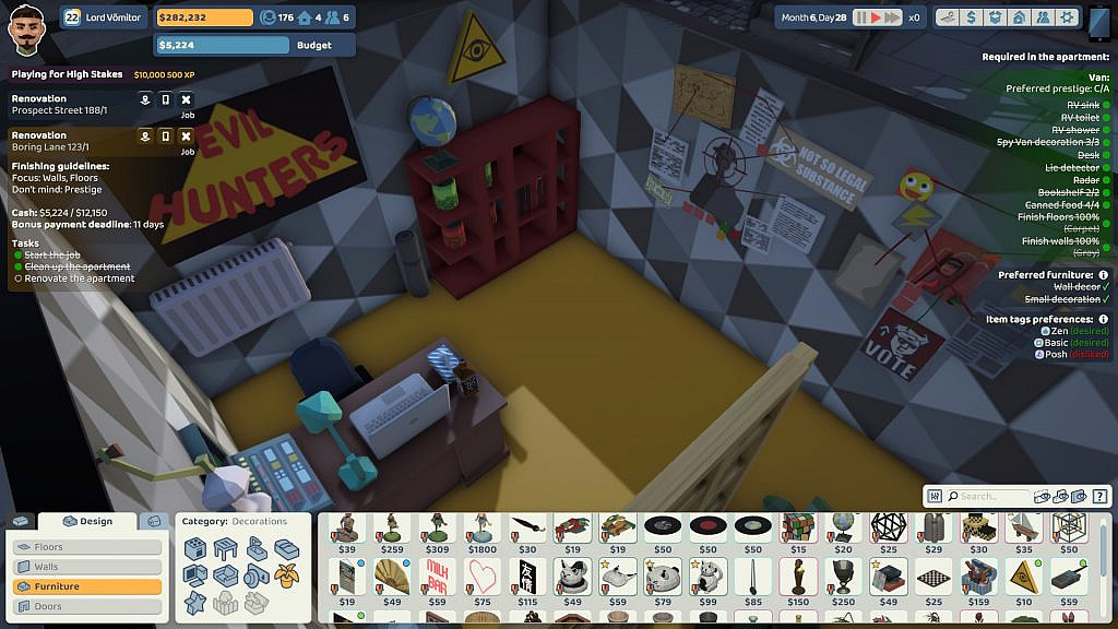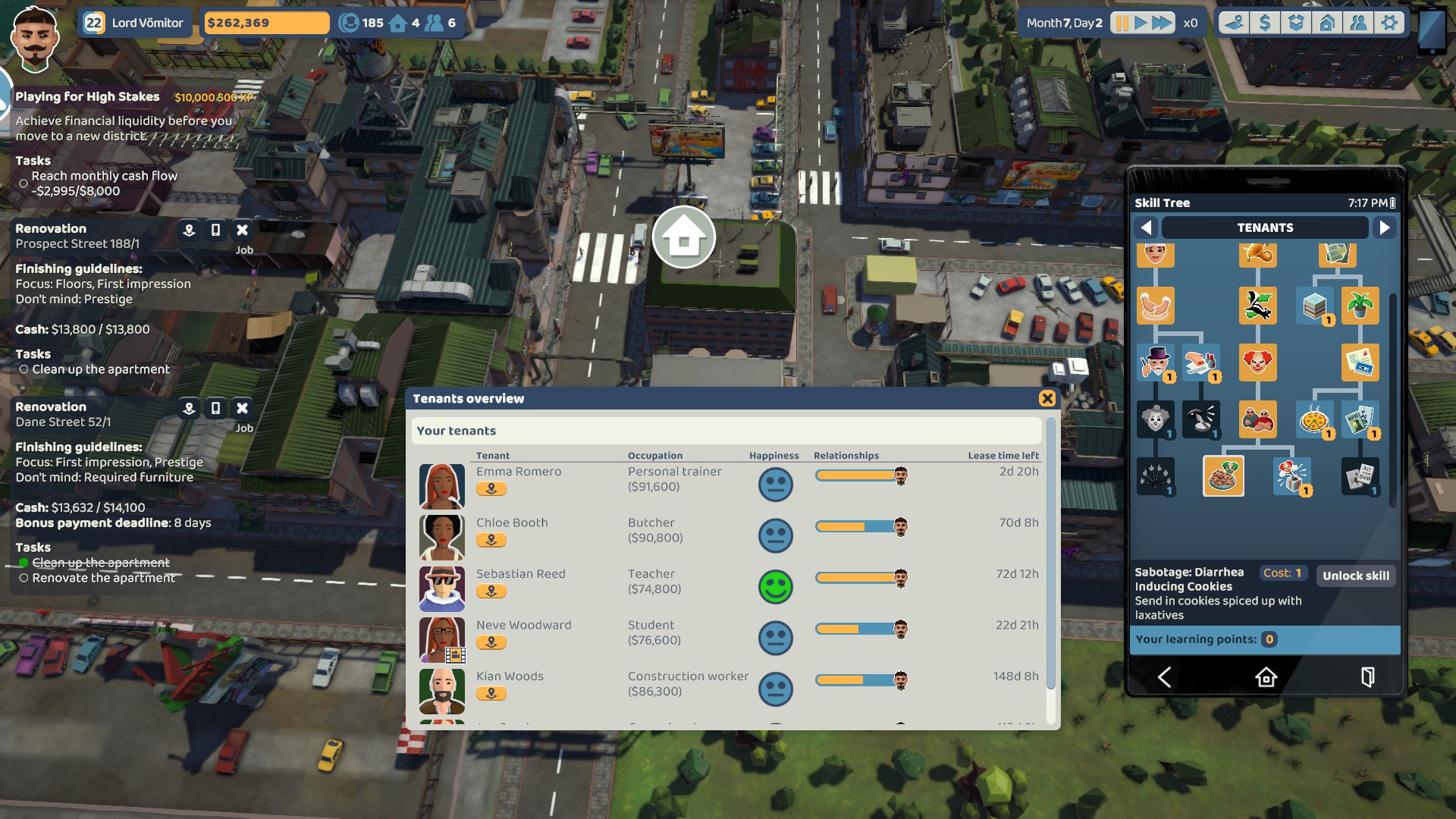 In renovation jobs, the customer always tells what kind of room they want, with what kind of furniture, plus what kind of prestige they are looking for. During these 30 hours I’ve played there’s been enough variance on these jobs and especially the rare special jobs are cool: I have renovated for example a tinfoil hat conspiracy theorist’s tiny spy van and a huge combination of speakeasy and drug lab. Like the ones before there are some adult themes in the game and some themes don’t vibe that well. For example the three-sided talent tree you put points into while leveling up in the game: One branch is to boost your uncle Steve, who is your avatar for cleaning up apartments before the renovation, one is for money and marketing and one is for handling your tenants. The last one gives you a bunch of tools to gift and bribe your tenants but also to pester them. I have to say that even if my tenants would be troublesome and annoying, sending them a diarrhea inducing cookies or a skunk would feel a bit too much.