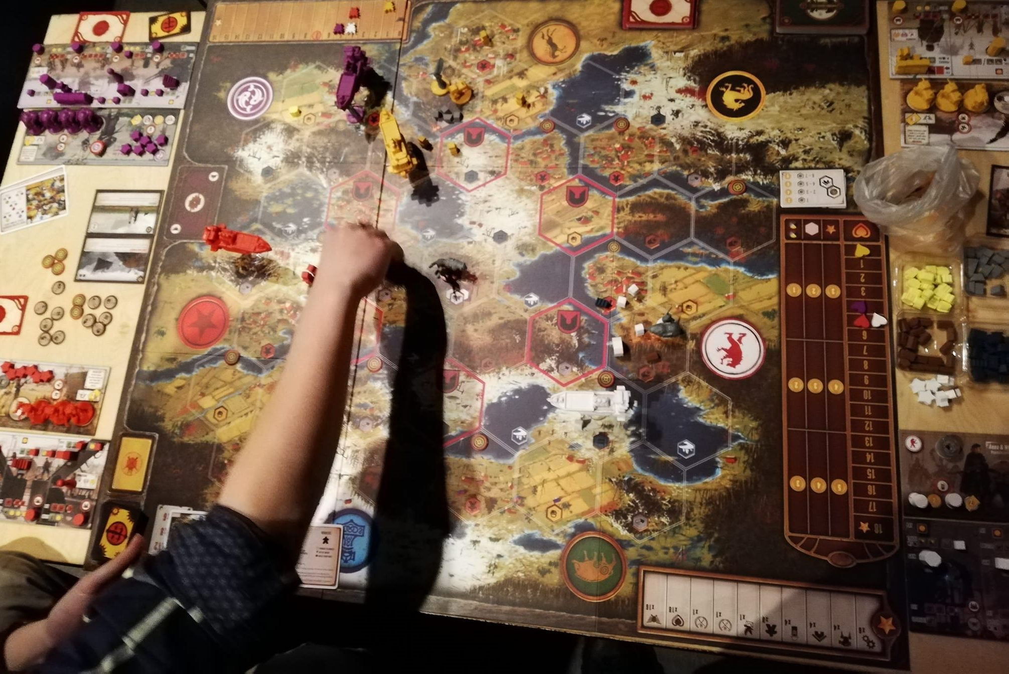 While the base game guarantees a lot of hours of fun, the expansions released are just an added bonus of awesomeness. To date, Scythe has three expansions, namely ‘Invaders from afar’ which adds two new factions to an already varied list, ‘The Wind Gambit’ where players get to control their own flying ships and last but not least ‘The Rise of Fenris’ which is by far the best expansion l have seen in any boardgame. Cannot recommend these expansions enough! ‘The Rise of Fenris’ is basically the campaign version of the game that you play together with your friends who are also your opponents during the ordeal; there are alliances, wars and surprises provided by the instructions you receive as soon as you open the expansion box: ‘Do not open any of the boxes inside until instructed to do so’. Playing through the campaign allows you to unlock access to these boxes and the story that goes with them. Various new additions to the game and twists make this the very best expansion, in my humble opinion.