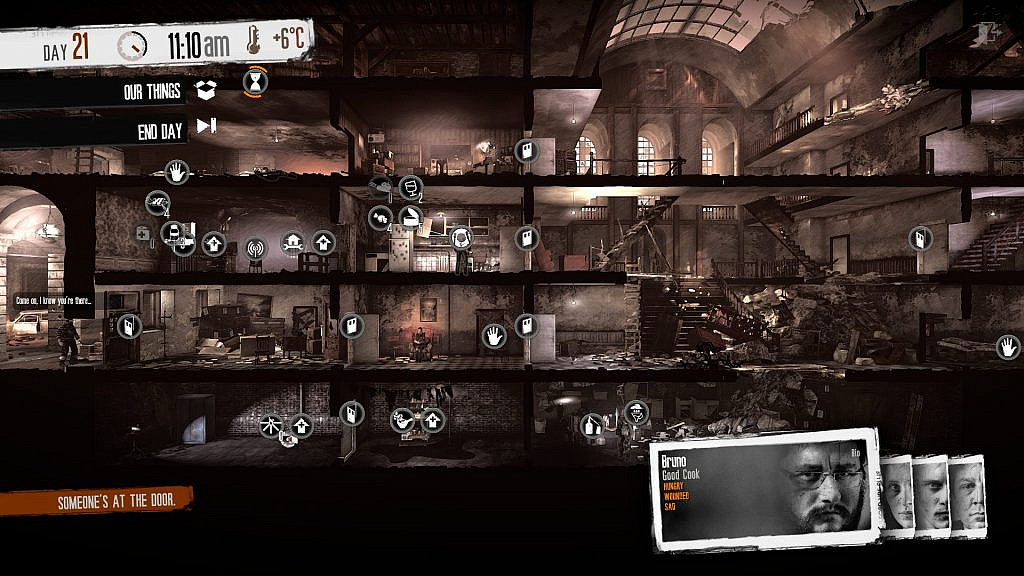 This War of Mine is a survival game, that puts you in the shoes of civilian survivors in the war-torn, fictional city of Pogoren. The goal is to hold on to spark of life amid constant danger and try to survive until the inevitable(?) end of the conflict. To succeed, you must control the survivors as they maintain their home. In the beginning the game is very generous with resources. This will change, however, and soon difficult decisions need to be made.