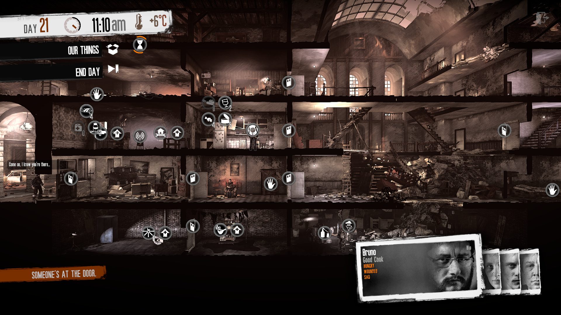 And heavy theming this game indeed has: War and very real, everyday horror for the people stuck in the middle of it. The game sets these themes front and centre. The hopelessness oozes out from the drab colours, noises of violence, bodies littering locales and body languages of characters as they, after a rough night of scavenging, lay down to floor to have good cry.