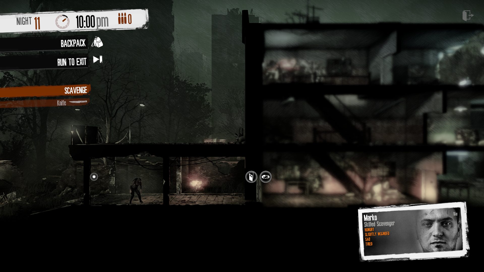 Night-time is where the immediate dangers (and rewards) lie. Each location throws in some surprises. Some buildings are abandoned, some not, and you are as likely to encounter a down-on-their-luck beggar willing to trade, as well as gun-toting maniac. This is also where morality comes into play, and player-made tragedies are inevitable. Since basic resources can be found almost anywhere, but more essential ones like food and medication are usually harder to come by, you´ll eventually have to move into more dangerous areas. Will you trade? Will you steal? If someone sees you, you might have no choice but to fight, leaving behind a cold body. Since your inventory space is also limited, there is the added puzzle of pondering what is it you need most. All of this is done under tight time constraints. When you finally run off into the night, the “what ifs” are there to keep you company.