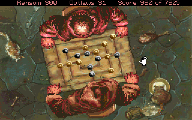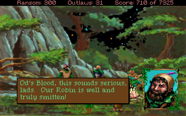 The usual Sierra game score counter displaying current points from a maximum attainable score is now also accompanied by a counter for your band of outlaws and also the gathered ransom money. With the score counter going into thousands, a significant inflation has occurred, since points seem to be awarded in tens or hundreds. Nevertheless, the score system is accompanied with many solutions to puzzling problems, presented an intriguing and innovative approach to the genre, for its time at least.