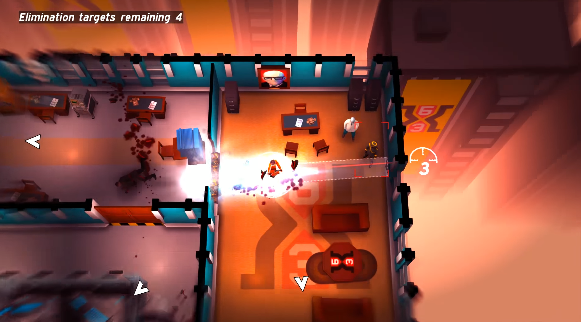 You can perform combos by ending the lives of multiple bad guys in a row while in slow-mo. The further you progress in the game the more combo abilities you unlock. For example, two consecutive slow-motion kills earn you a dash, which can be used to make a new entrance into a room if a door is out of the question, and decimate everything living in your path at the same time. The game does a fairly good job of utilizing these skills to solve puzzles; in one particular level, you need to get past a rapidly firing laser gun, and the only way to do that is to stop time completely. Lucky for you this can be done by sending eight bad guys to the pearly gates, while in slow-mo of course.