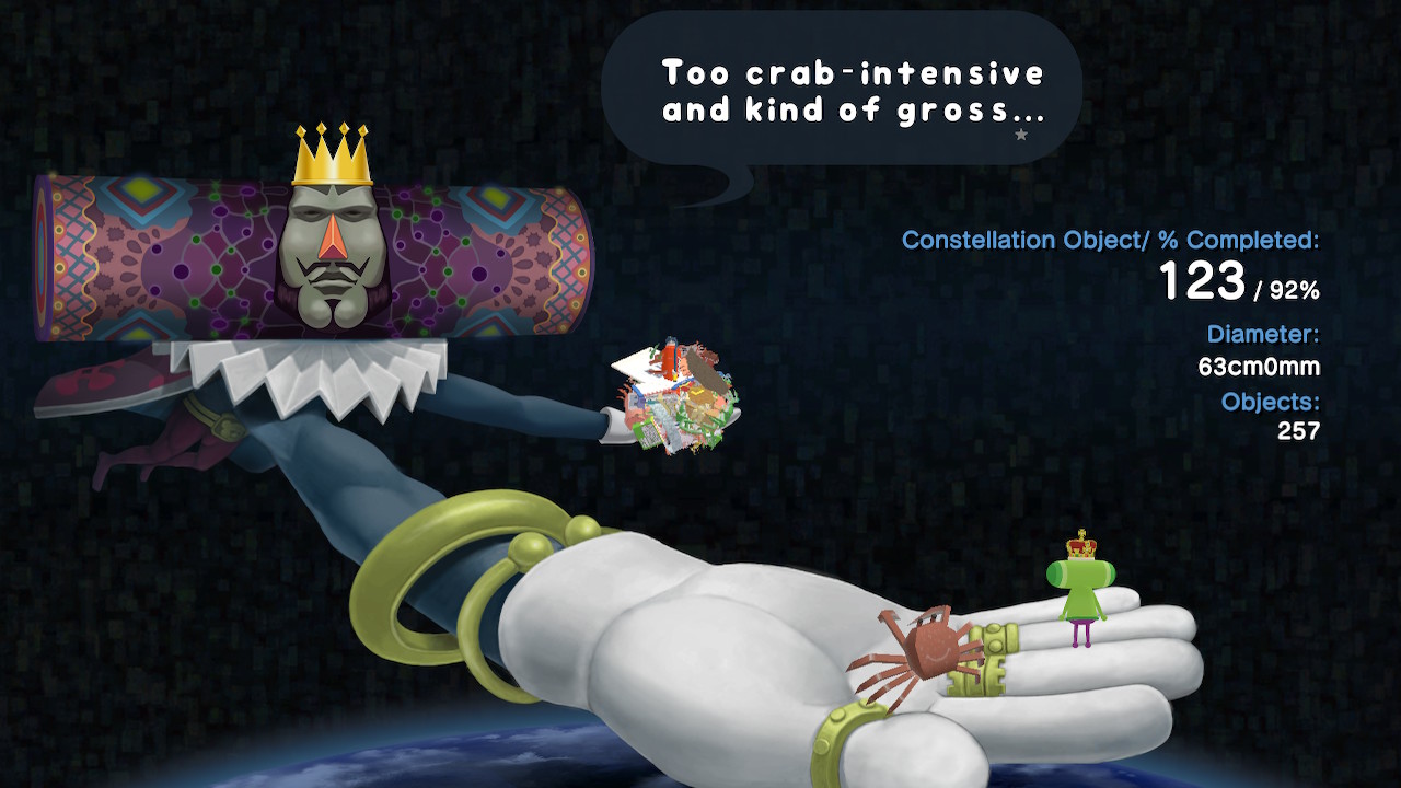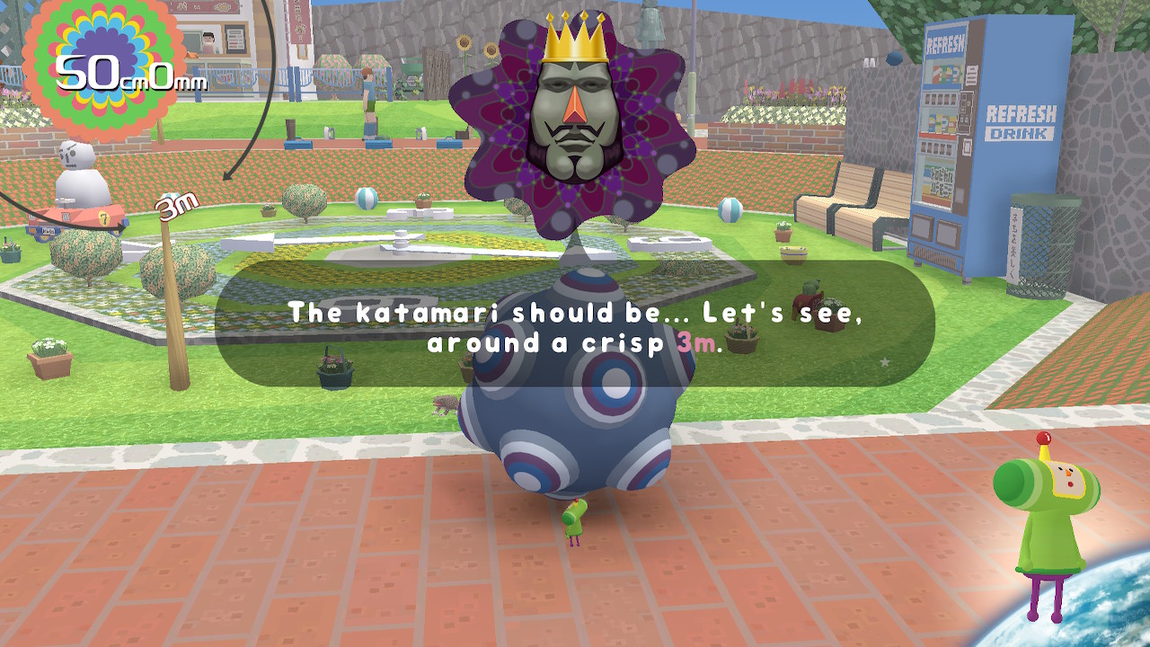 Another annoying part is the collision in the game. When you collide with something larger than your katamari, you will lose some of the items you have collected. Larger animals and humans will try to pounce you, sending you flying in the opposite direction. If you get stuck in a corner or a hole, you start to spew your precious junk and reduce the katamari in size. I got stuck a few times just before running out of time, which made me smaller than the required size and subsequently fail the level. A katamari not meeting the standards makes the King of All Cosmos very disappointed. It is scary!