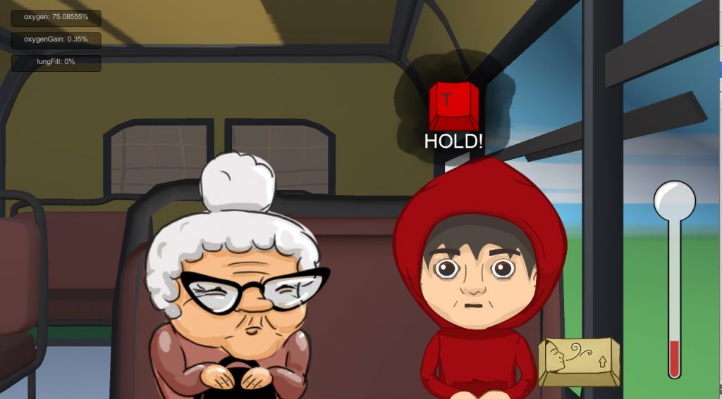 (Avoiding) Small talk in public seems to be something most of us can relate to, so of course there’s a game about it! This game could be interpreted as a transmission management game as you’re put in the spot with a friendly grandma trying to make conversation with you on a bus, while you’re just managing to get by in the conversation. Players press down on the alphabet button that pops up on the screen, and that presumably means that you managed to do fine with something that grandma mentioned. As you frantically try to figure out which button to press down and let go (grr dat left-right hand and fingers coordination), be careful that grandma might smother you with her enthusiasm. There are meters that gauge oxygen flow in-game, but at this moment it doesn’t go into play. That said, it would be interesting to see how this game plays out released as a full fledge game (with increased difficulty over time, and controlling your breathing coming into play), because I personally would take this as a measure of my social skills.