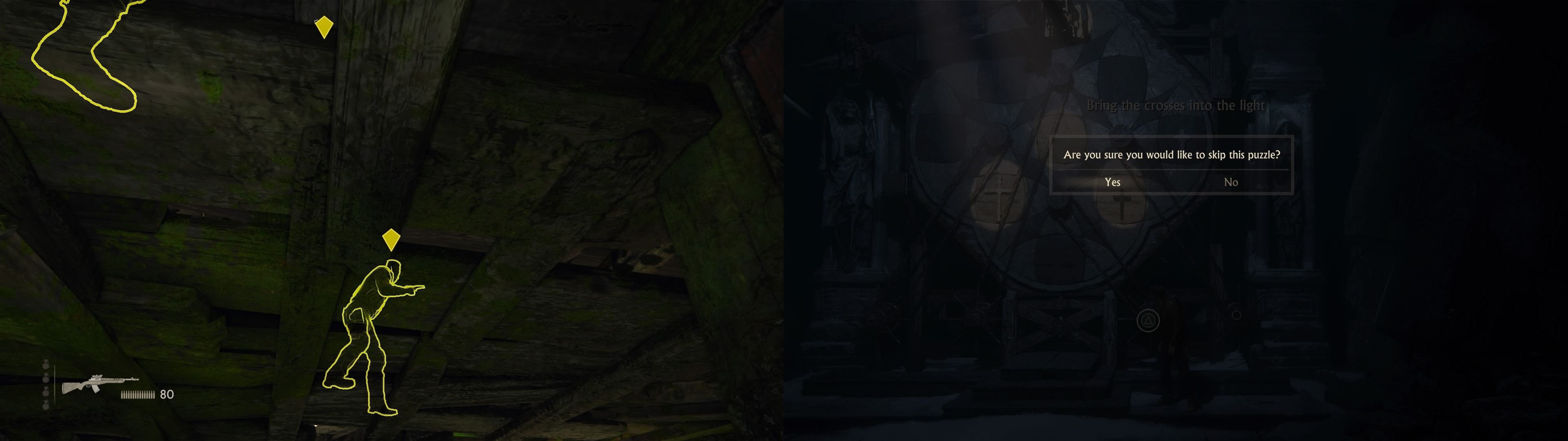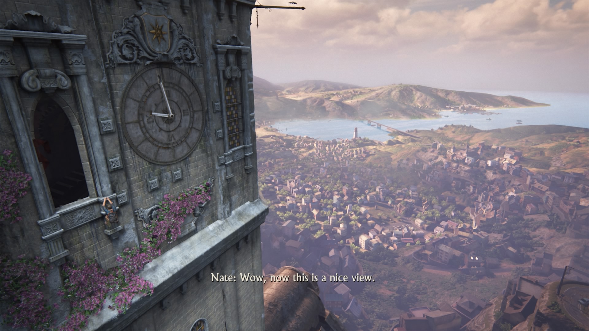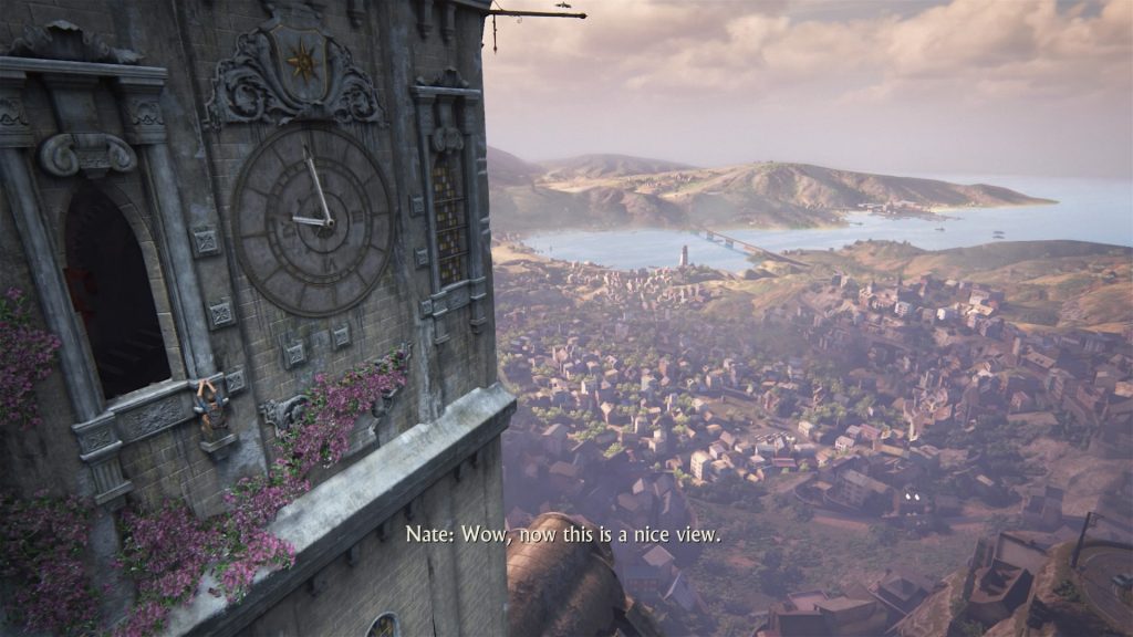 As you serendipitously stumble from one ancient artefact to another through increasingly outlandish scenarios, the design ethos of the series becomes apparent: the gameplay acts as a vessel for the “cinematic” experience, the player has very little meaningful input beyond moving the story forward as preordained by the designers. The game momentarily removes certain interactions (such as jumping) from the player during certain scenes, while in others it offers the illusion of control via vapid context sensitive button prompts, like tapping square multiple times to open a door. Even beyond that, that kind of contemptuous attitude towards player agency permeates just about every facet of the design. Ludonarrative dissonance rears its head when you aren’t able to land a single punch (or roll) in one of the boss fights despite Nathan’s combat prowess, and the numerous death defying leaps you make throughout the journey seem very inconsistent from normal jumping physics as Nathan isn’t able to clear small humps that weren’t meant to be climbed. Likewise the minimalist HUD makes the health system very opaque.