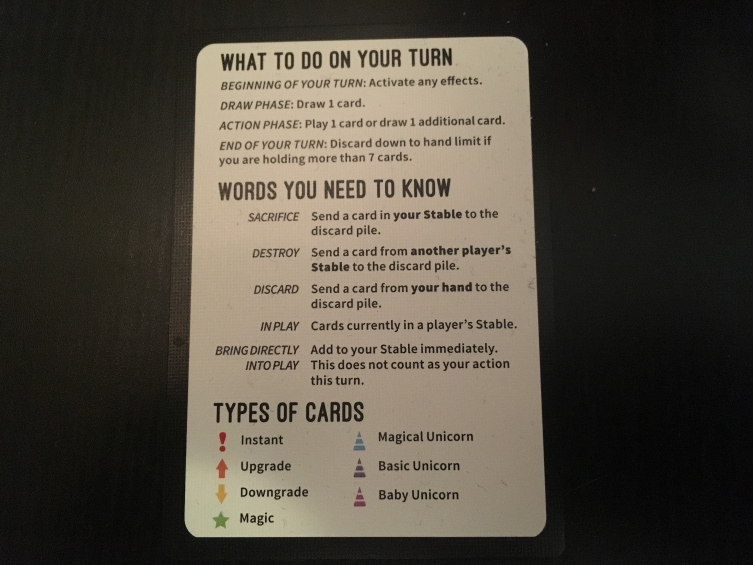 The game is meant for two to eight players and is relatively easy to pick up. Apparently not as easy as intended, however, since the game is supposed to last 30-45 minutes, which quickly turned into well over an hour with our group of six – all of us first-timers except for one. Although the basics of the game are still fairly easy to learn, it doesn’t hurt that Unstable Unicorns also has cards containing condensed instructions on playing a turn, some useful terms, and information about different card types. A sort of a cheat sheet, if you will. These are handed out to every player, helping to smooth out the flow of the game if the newbies forget a rule or two.